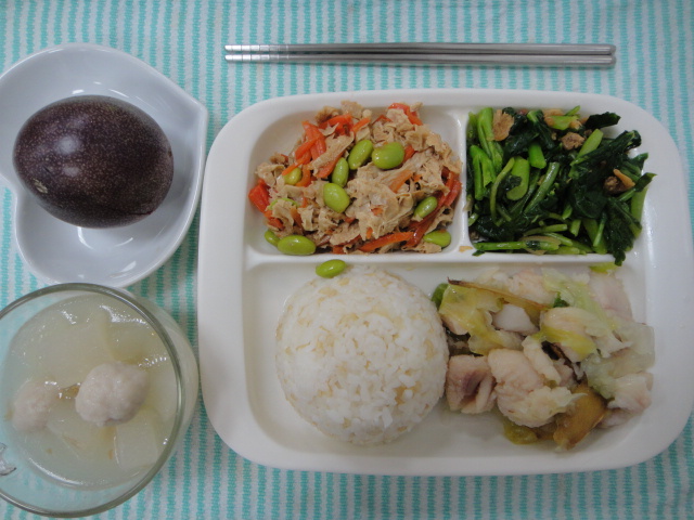 晚餐菜色:白飯/北海鮮魷/鐵板豆腐/時令青菜/八寶甜湯/水果
